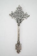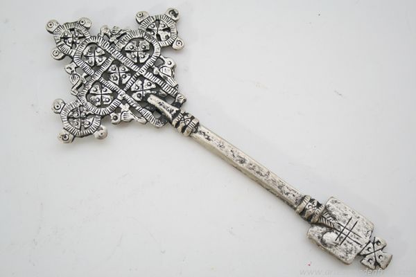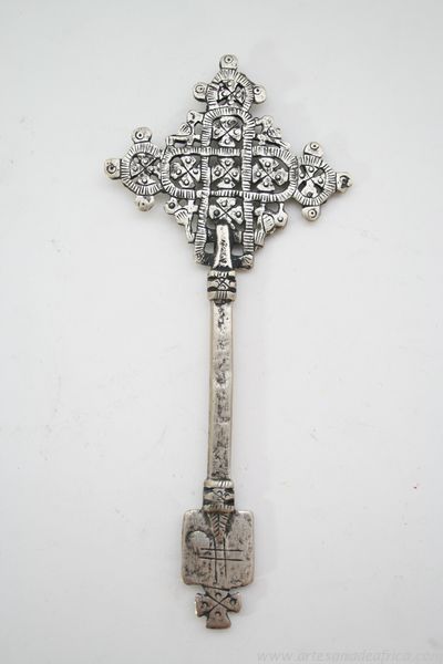 Tradicional cruz de mano etiope de bendición, realizada artesanalmente en aleación de plata y zinc mediante la técnica de cera perdida. Utilizada por los sacerdotes de la iglesia copta de Etiopía en sus actos religiosos.