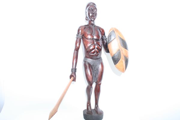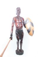 Talla realizada con gran realismo y hasta el más mínimo detalle en madera de teca, en donde se representa a un mítico guerrero de la étnia de los Mandingo. Tanto el escudo como la lanza, también realizadas en teca, son piezas que se incorporan y ajustan perfectamente a las manos del guerrero. Mide aprox.: 115 cm de alto x 45 cm de ancho. Peso aprox.: 13 Kg Pertenece a la asociación de artesanos del África Occidental.